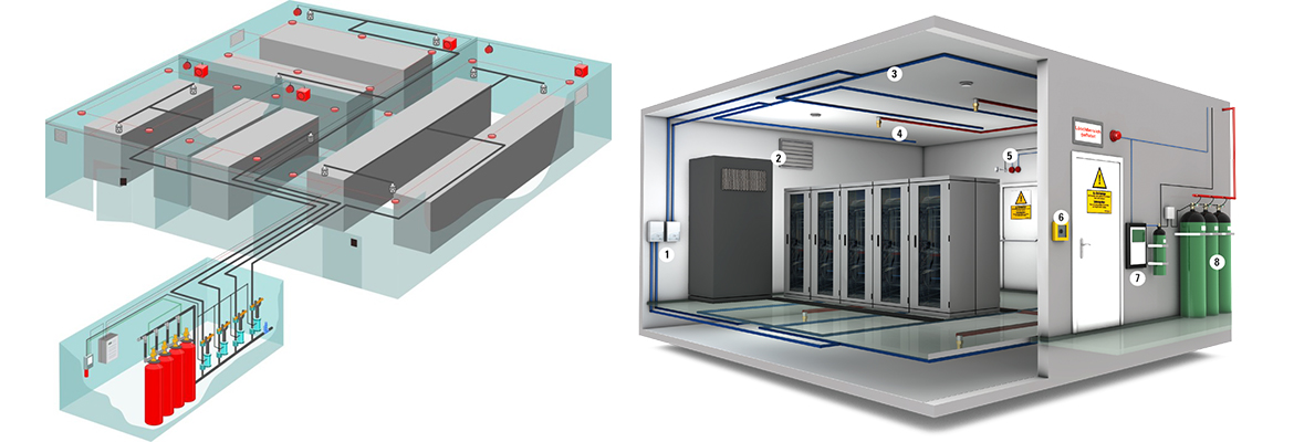 According to the National Fire Protection Association (NFPA), a clean agent is an electrically non-conducting, volatile, or gaseous fire extinguishing that does not leave a residue upon evaporation. A clean agent fire suppression system uses either a chemical or inert gas to suppress a fire at the inception stage before it can grow and is incredibly effective in extinguishing Class A, B, and C fires.Clean agent fire suppression systems are safe to use in occupied spaces, require no clean up after discharge, and are environmentally friendly with a short to no atmospheric lifetime and a low Global Warming Potential (GWP). Systems are designed around providing total flood protection for small enclosed areas or entire rooms containing sensitive documents or equipment. The most common types of clean agent systems use chemical agents like FM-200™ (HFC-227ea) and 3M™ Novec™ 1230 Fire Protection Fluid or inert gases, which are made up of gases like nitrogen, argon, and carbon dioxide. All clean agents are stored as either a gas or liquid, and when the system activates, it releases the clean agent as a gas to suppress the fire. Upon discharge, the clean agent removes or disrupts one of three elements needed to sustain a fire – heat, oxygen, or the fuel source. Most clean agent fire suppression systems reach extinguishing concentration levels in just 10 seconds or less, making them highly efficient in suppressing a fire before significant damage can be done. Because clean agents quickly evaporate, there is minimal downtime as no clean-up is required. Clean agent fire suppression systems protect valuable assets and equipment when traditional fire sprinkler systems using water or foam would create as much, if not more, damage than the fire. Some typical applications and areas protected by clean agent systems include: