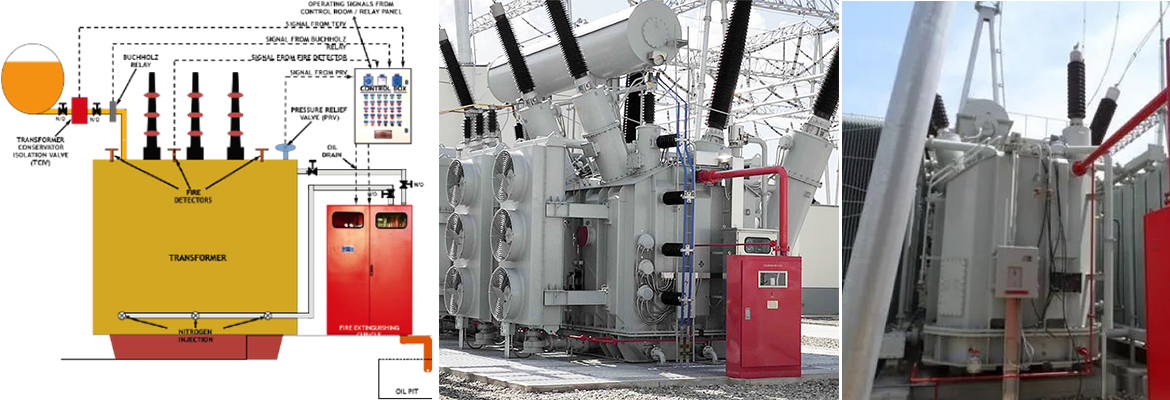 Nitrogen Injection Fire Protection System (NIFPS) is a fire protection system which prevent oil tank explosion or rupture and possible oil fire in event of minor nature of arcing due to internal faults in Oil filled Power transformer. It also prevent damage to transformer and surrounding equipment etc. The NIFPS shall be provided with automatic control for fire prevention and fire extinction. Remote electrical push button control at Control Box and local manual control in the fire extinguishing cubicle shall also be provided additionally.